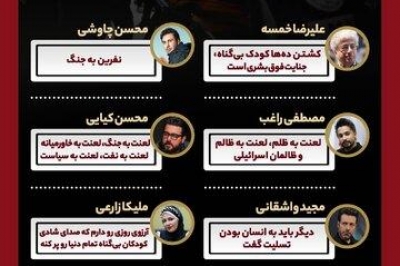تعداد زیادی از هنرمندان و چهرههای شناختهشده کشورمان، با انتشار پیامهایی در فضای مجازی نسبت به حملات اخیر رژیم صهیونیستی به غزه واکنش نشان دادند و حمایت خود از فلسطین را اعلام کردند. در این اینفوگرافیک دلنوشتههای ۱۰ هنرمند و چهره شناخته شده را بعد از وقوع این فاجعه مشاهده میکنید.
